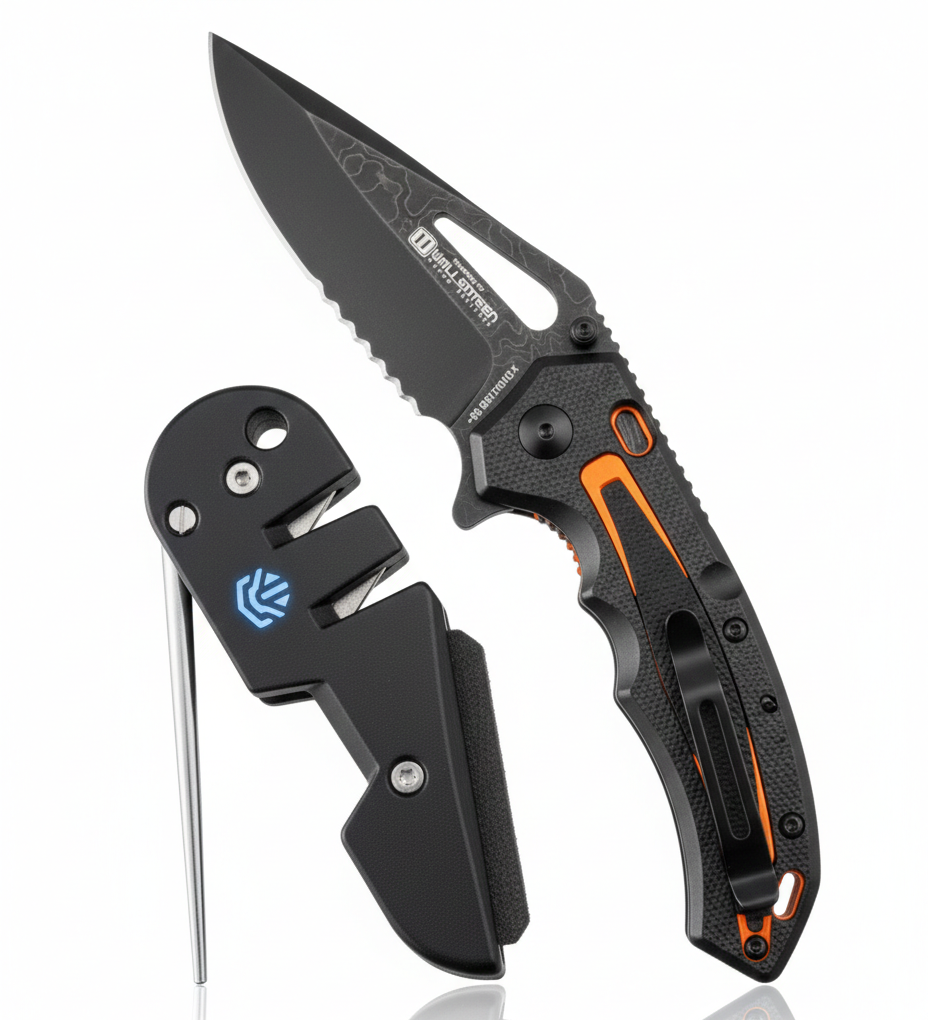 – Diamond-coated tapered rod (600 grit) supports rapid edge conditioning and detailed sharpening.