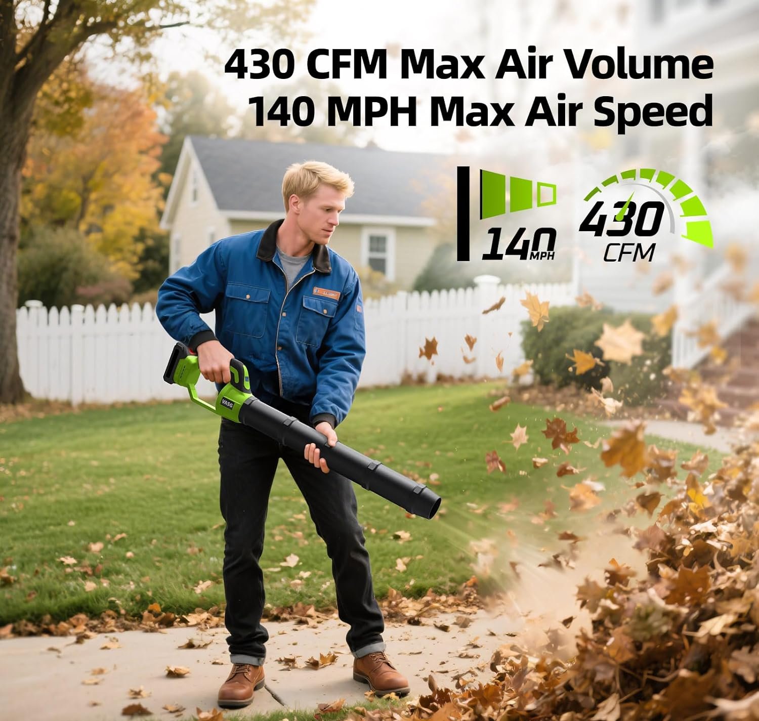 – High-performance motor delivers up to 430 CFM and 140 MPH to handle leaves, debris, and dust across lawns, patios, driveways, and garages.