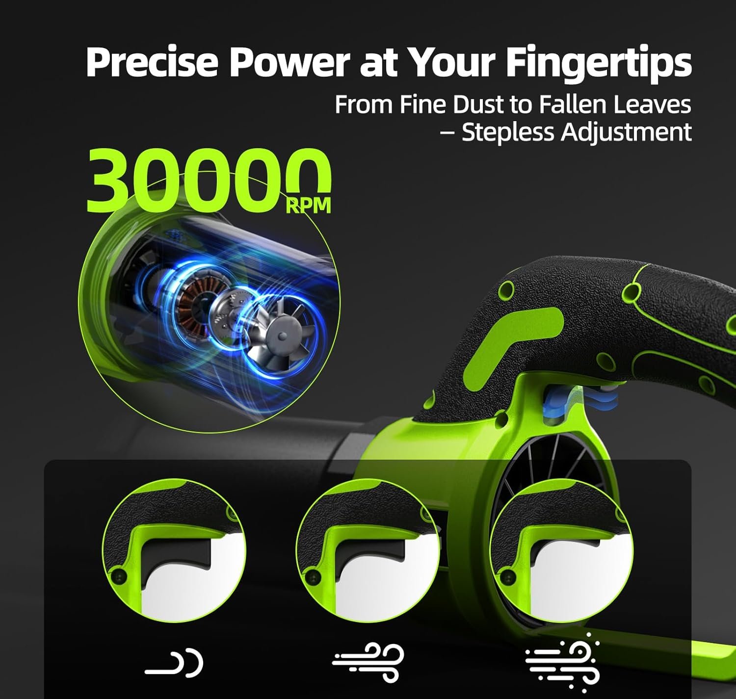 – Stepless speed control lets you adjust airflow output from low to high power; integrated digital display shows real-time battery status during operation.