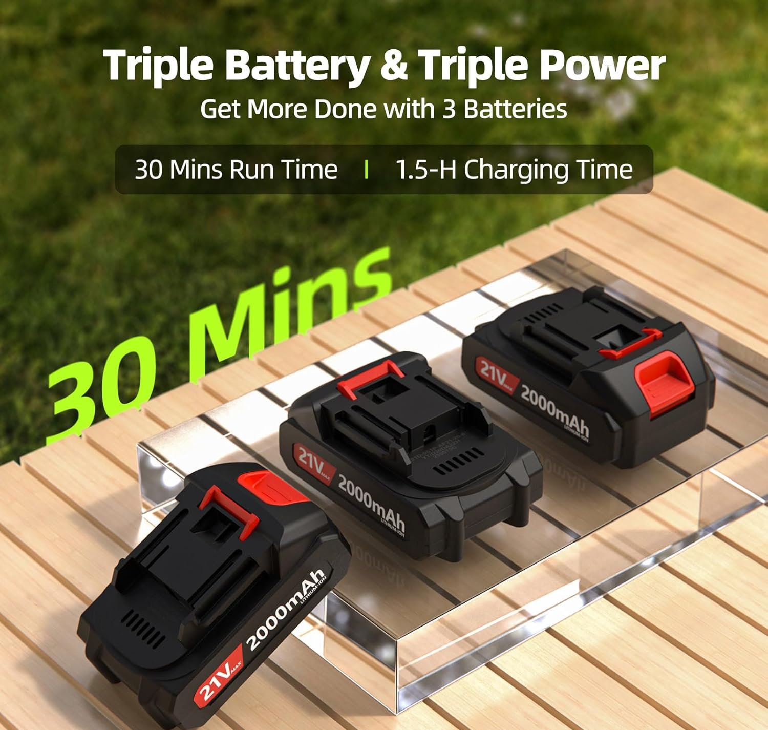 – Cordless leaf blower powered by three 21V rechargeable batteries, allowing extended runtime with quick battery swaps; includes fast charger with built-in temperature protection for safe, efficient charging.